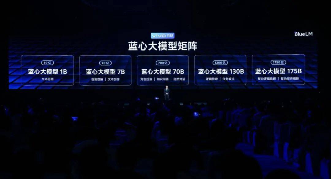vivo的解决方式是推出一个大模型矩阵,涵盖10亿、70亿、700亿、1300亿和1750亿,共计5个不同级别的大模型。这个大模型矩阵基本覆盖用户所有使用场景,并实现了10亿和70亿大模型的端侧落地。