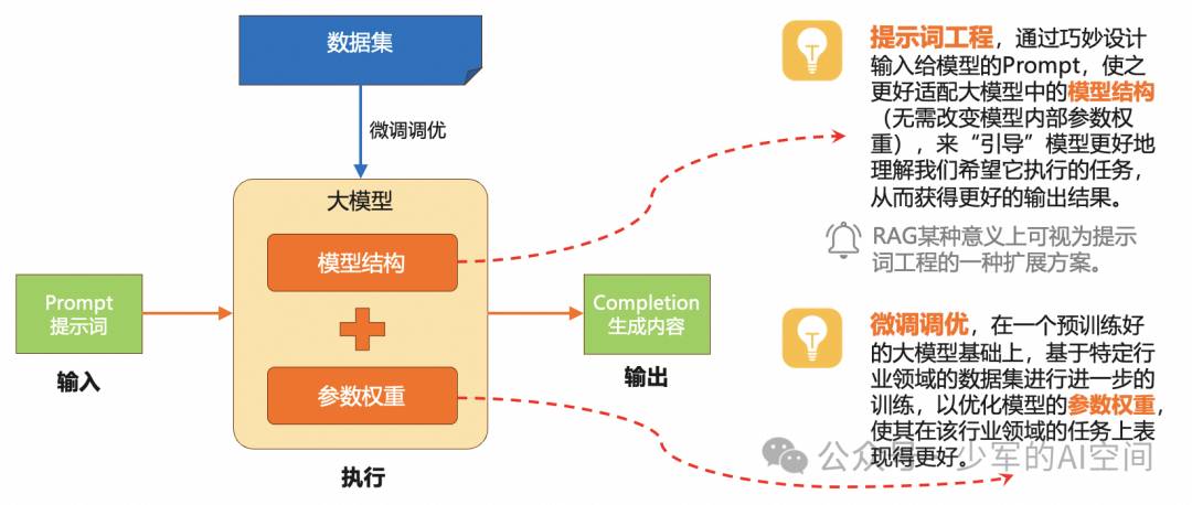 针对当前三种主流优化方案,这里简单补充做个说明。经常有人问上述三种方案核心区别是什么,怎么选?我们先回答是什么的问题。如下图所示,本质上大模型和程序一样,都是根据外部输入,然后执行后给出输出结果。程序=数据结构+算法,简单的对应过来,大模型=模型结构+参数权重。所以说,提示词工程,本质就是通过巧妙设计输入,使之更好适配大模型中的模型结构,从而获得更好的输出结果;微调调优,则是基于给定的数据集做训练,来优化更新大模型在预训练时已经固定好的参数权重,让后续的输入能在该行业领域的任务上得到更好的输出结果。
