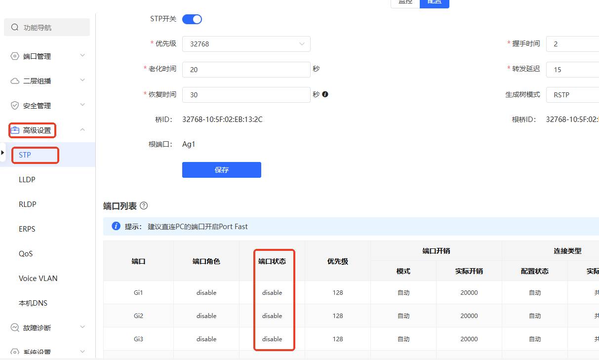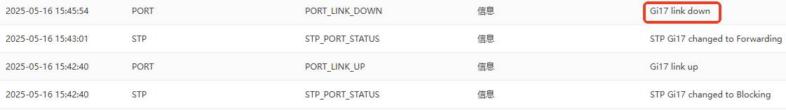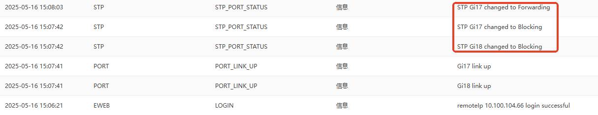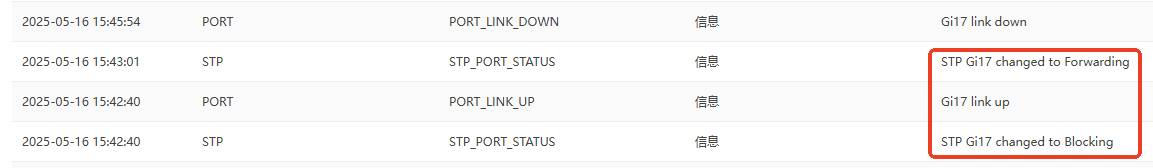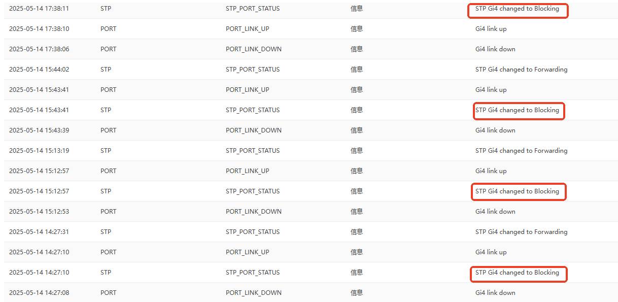 锐捷交换机在新接入设备和设备下线时,均会有 STP Blocking日志的产生,此方法判断环路信息的方式不太准确,如果想准确的查看内部是否有环路产生,可以查看STP下接口的状态。