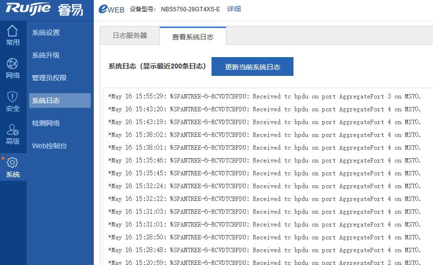 补充: 我的拓扑中核心交换机(NBS5750-28GT4XS-E)日志会经常打印出SPANTREE-6-RCVDTCBPDU的日志信息。