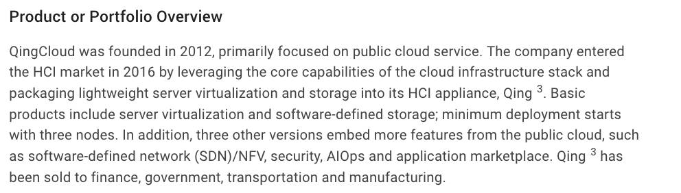 1.最初提供公有云服务,2016年通过利用其云基础架构栈的核心能力以及打包轻量级服务器虚拟化和存储形成超融合一体机 Qing3;