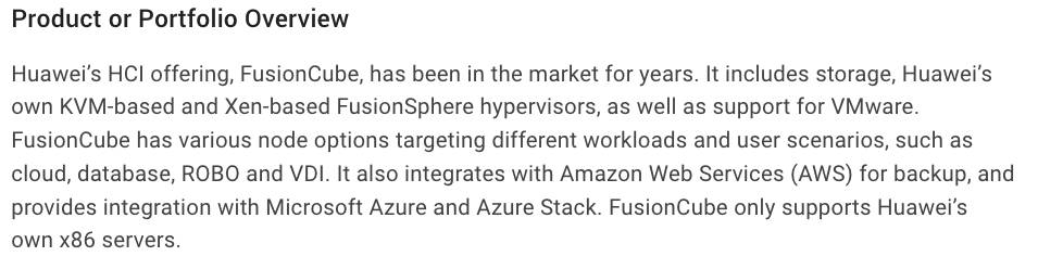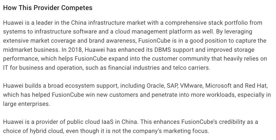 5.华为是中国公有云提供商,这也提升了 FusionCube 作为混合云方案的信誉,虽然该方案并不是公司市场聚焦的重点。