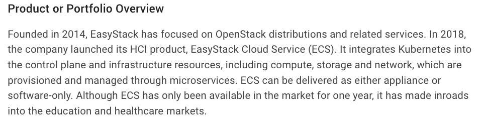 1.专注在 Openstack 发行版和相关服务,2018 年才发布其 HCI 产品;
