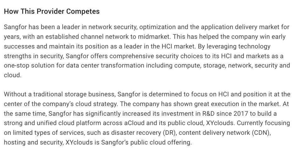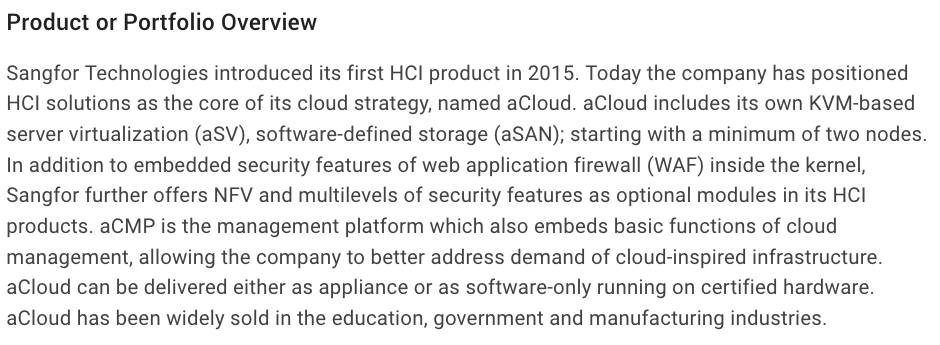 2. 通过利用其安全领域的实力,Sangfor 为超融合产品和市场提供了丰富的安全产品选项,从而提供了包括计算、存储、网络、安全和云在内的一站式数据中心转型解决方案。