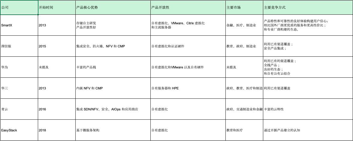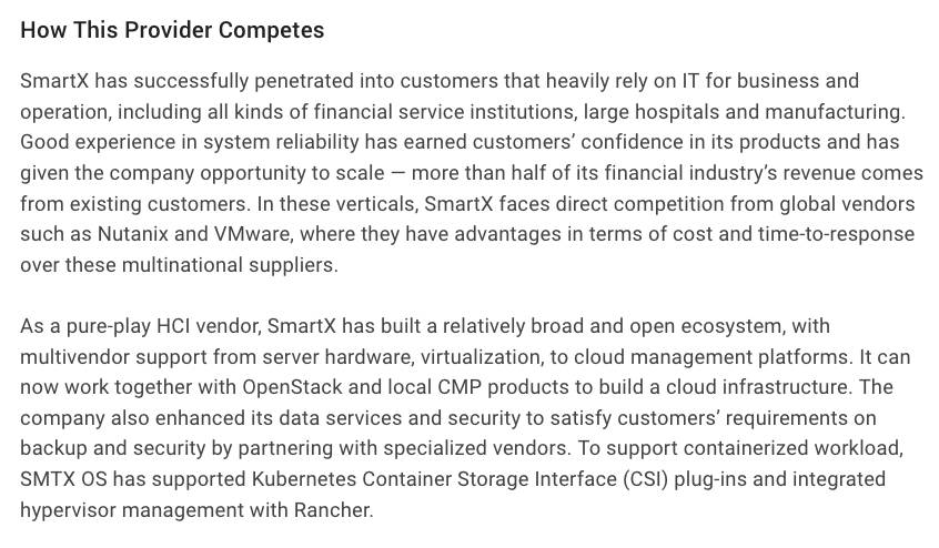 3.主要和一线厂商 Nutanix 、VMware 竞争,在用户对产品信任的基础上,具备更及时快速的服务响应以及更高性价比;
