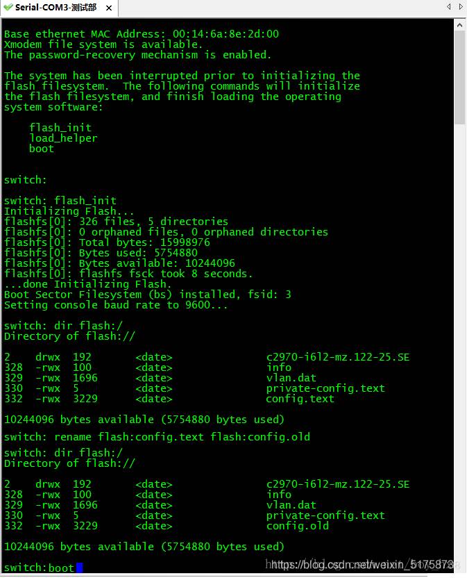 7、把config.text文件更名为config.old或其它(如下图)。命令:switch:rename flash:config.text flash:config.old