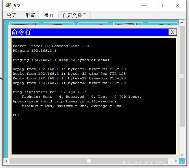 完成后用PC2 (192.168.1.2)ping PC1(192.168.1.1)