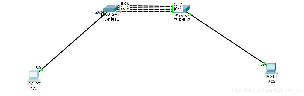 这里我将交换机s1和s2用四根双绞线连接,下面进行命令配置