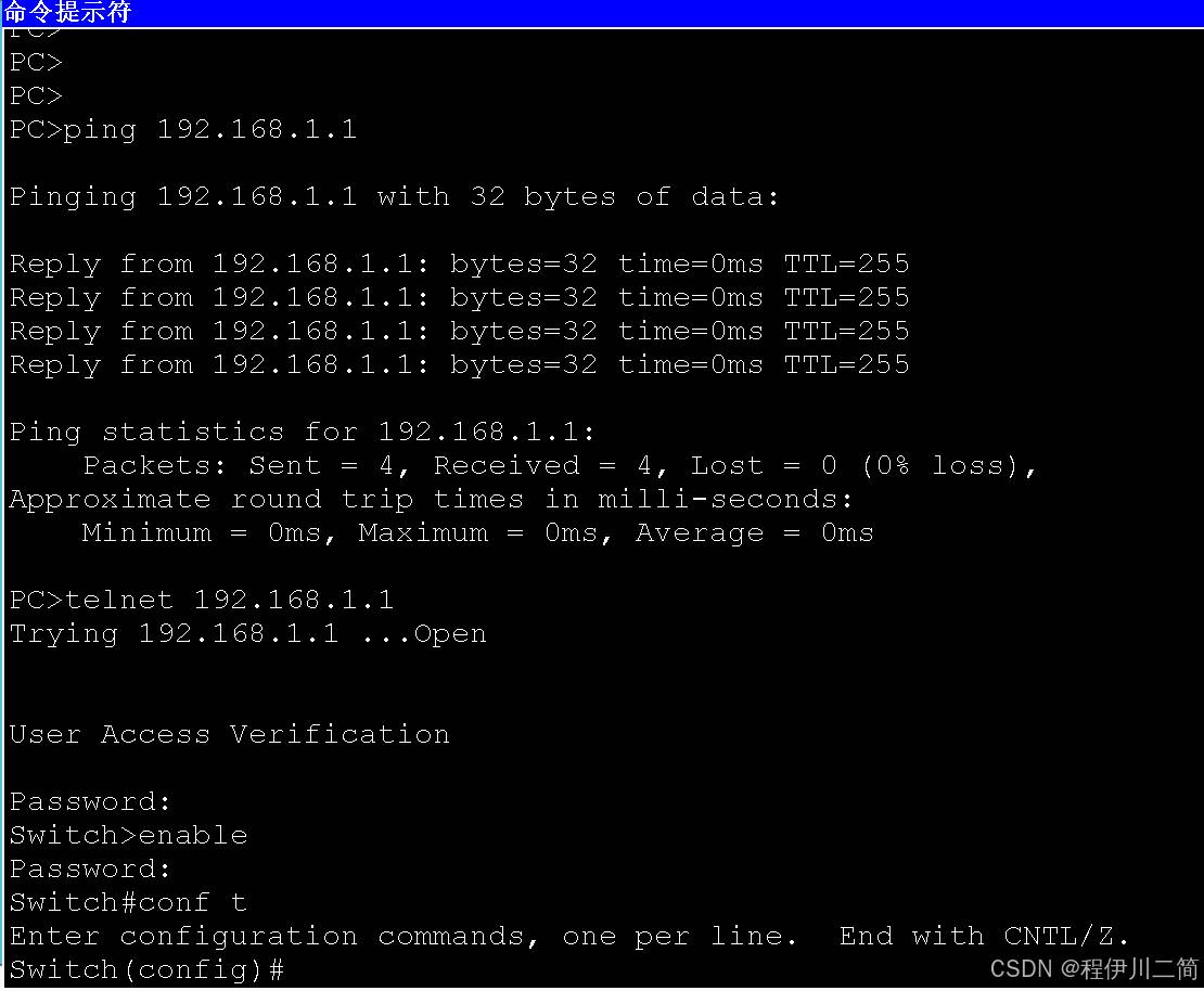 #6测试PC与交换机的连通性,进行telnet身份验证