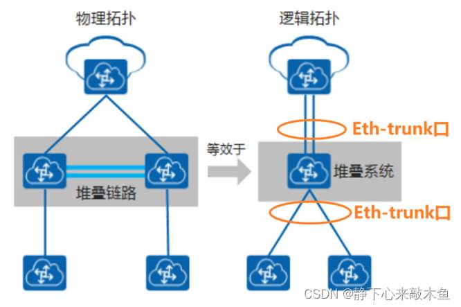 把多台支持堆叠特性的单独交换机组合在一起(单独交换机之间通过堆叠线缆连接在一起),从逻辑上组成一台整体交换机,从逻辑上像一台交换机实现报文转发,同时用户使用一个IP对堆叠进行管理和维护