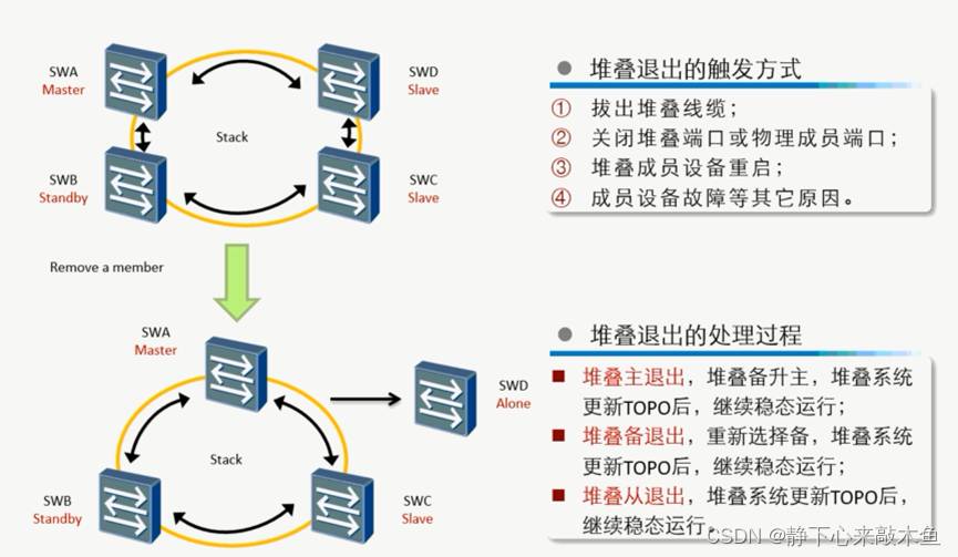 原主交换机会重新计算堆叠拓扑,将移出的成员交换机的拓扑信息删除,并将新的拓扑信息同步给其他成员交换机;