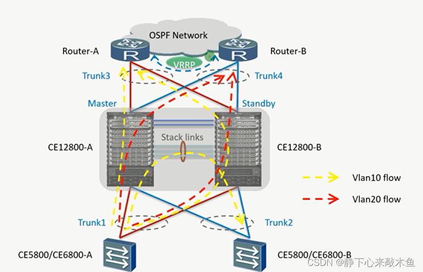 可靠性高,堆叠内一台设备故障,其他设备可以接管堆叠的控制和转发,避免单点故障