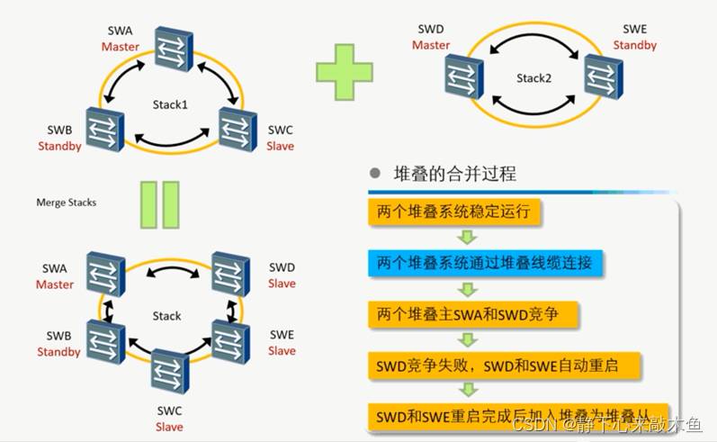 将稳定运行的两个堆叠系统合并为一个新的堆叠系统,两个堆叠系统的主交换机进行竞争