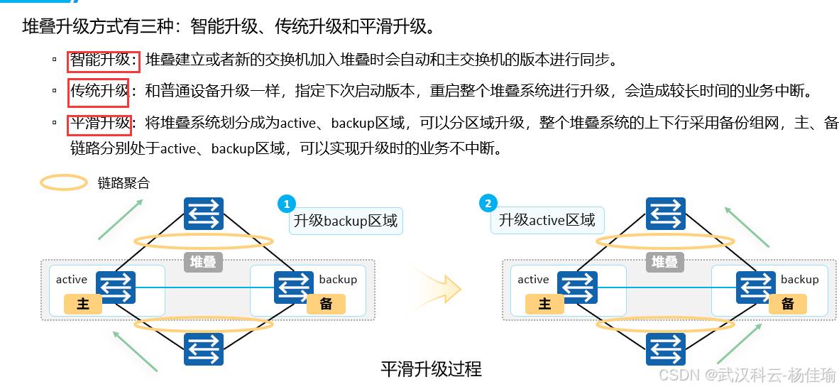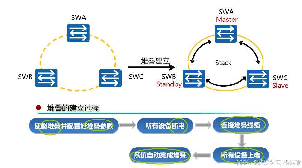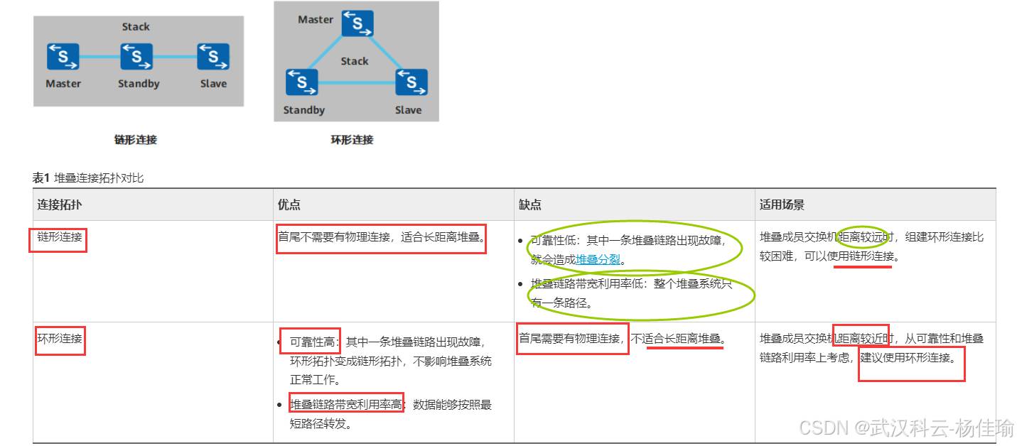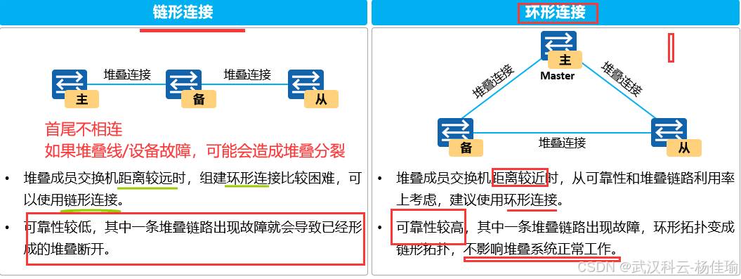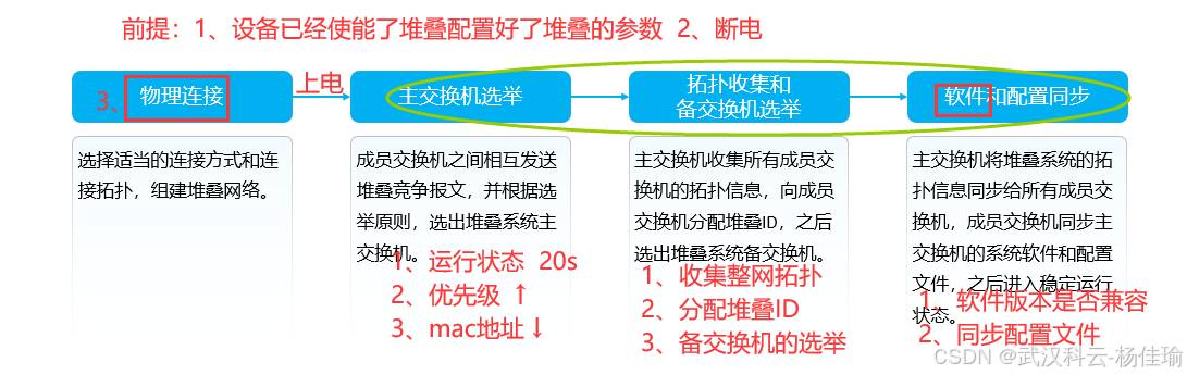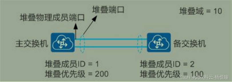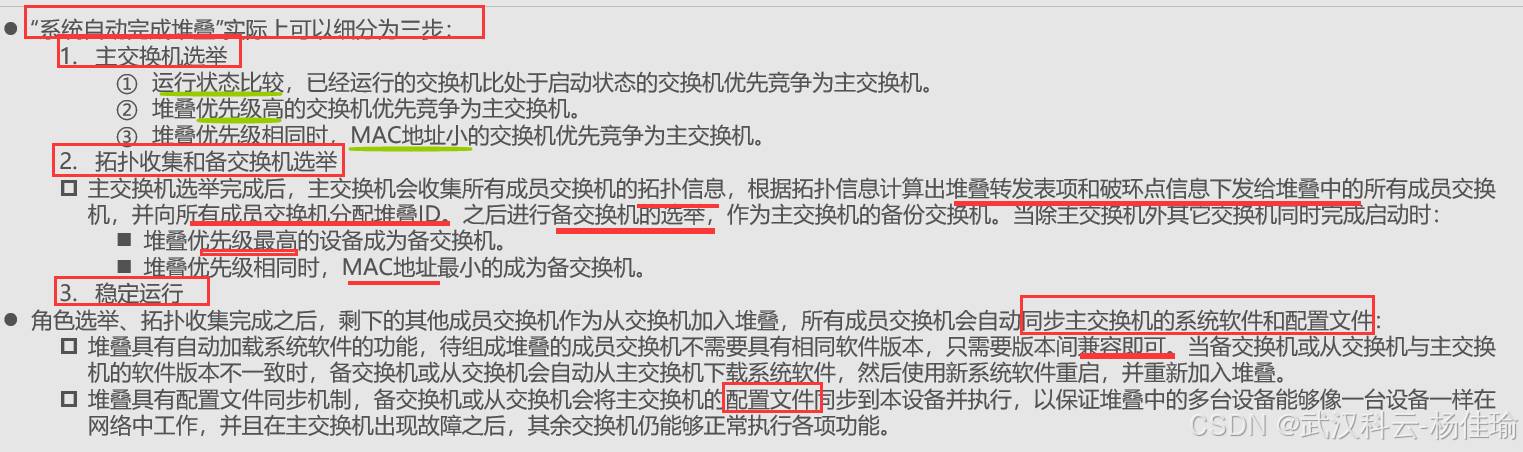 1.主交换机 ---负责管理整个堆叠系统,只有一个,优先级高的设备为主交换机,(并不准确,其实要看设备的启动顺序,如果启动时间相差在20秒内,就忽略启动时间的差别,通过优先级来进行比较,优先级比较不出来的话比较MAC地址)