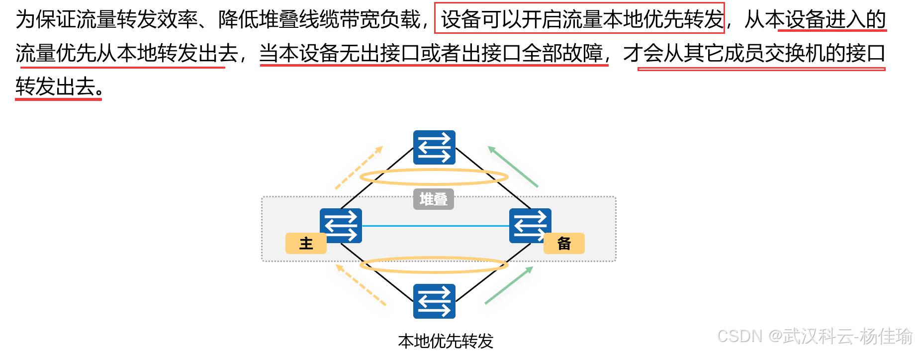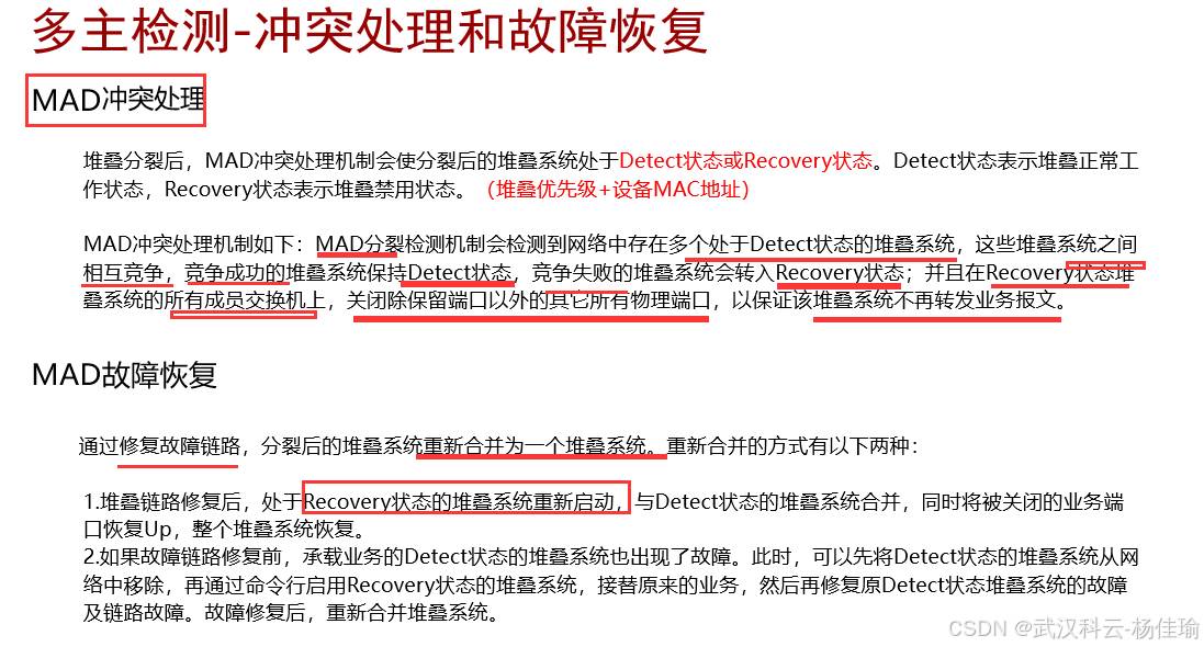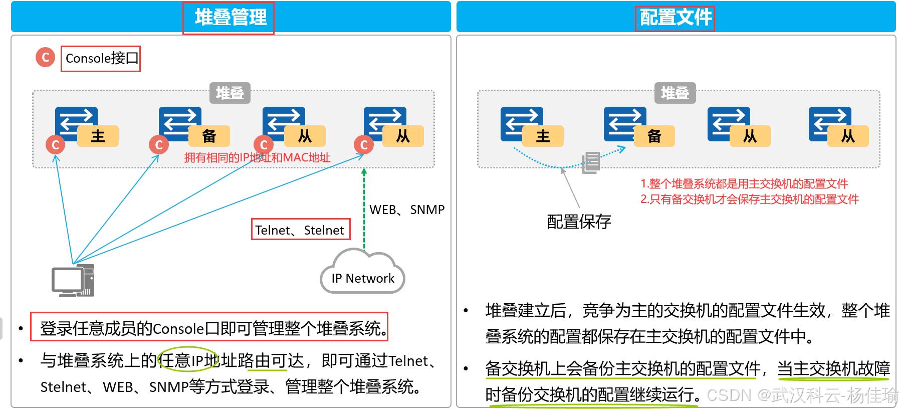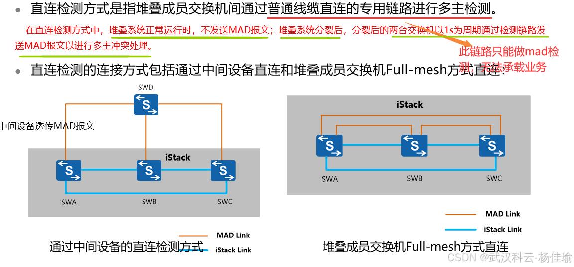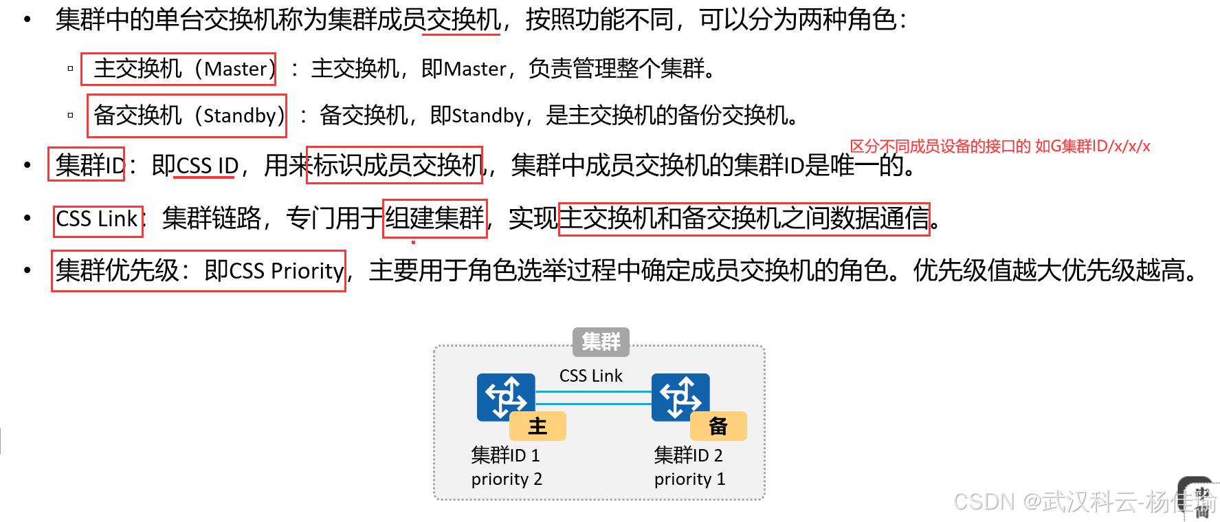 1.主交换机 ---负责管理整个堆叠系统,只有一个,优先级高的设备为主交换机,(并不准确,其实要看设备的启动顺序,如果启动时间相差在20秒内,就忽略启动时间的差别,通过优先级来进行比较,优先级比较不出来的话比较MAC地址)