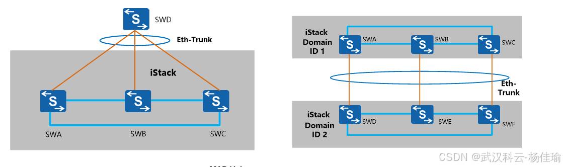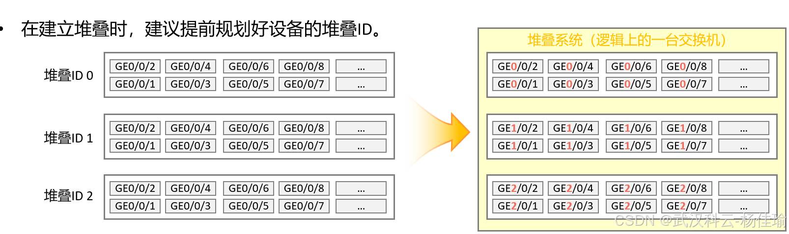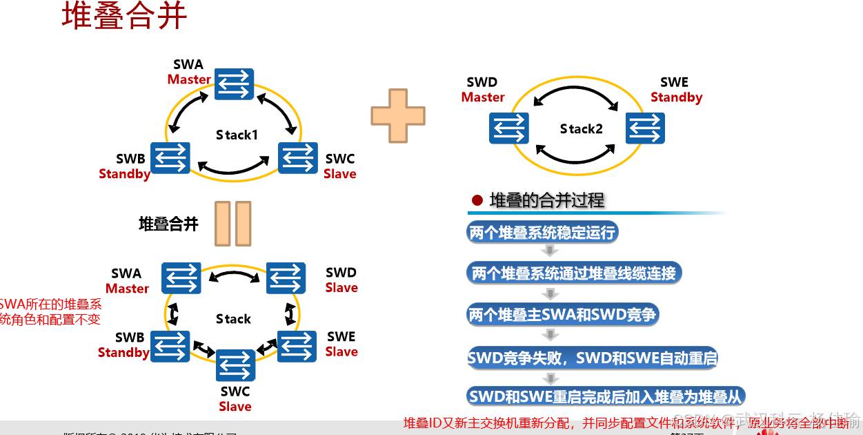 同一个堆叠系统内的交换机,设置的堆叠ID不同(堆叠ID用于标识堆叠系统内唯一的交换机),但是设备可能会存在相同的接口(堆叠之后,同多个设备会逻辑成为一台设备,堆叠系统内所有的设备名称都会成为主堆叠设备的名称,多台设备的接口会同时存在在同一台设备上),