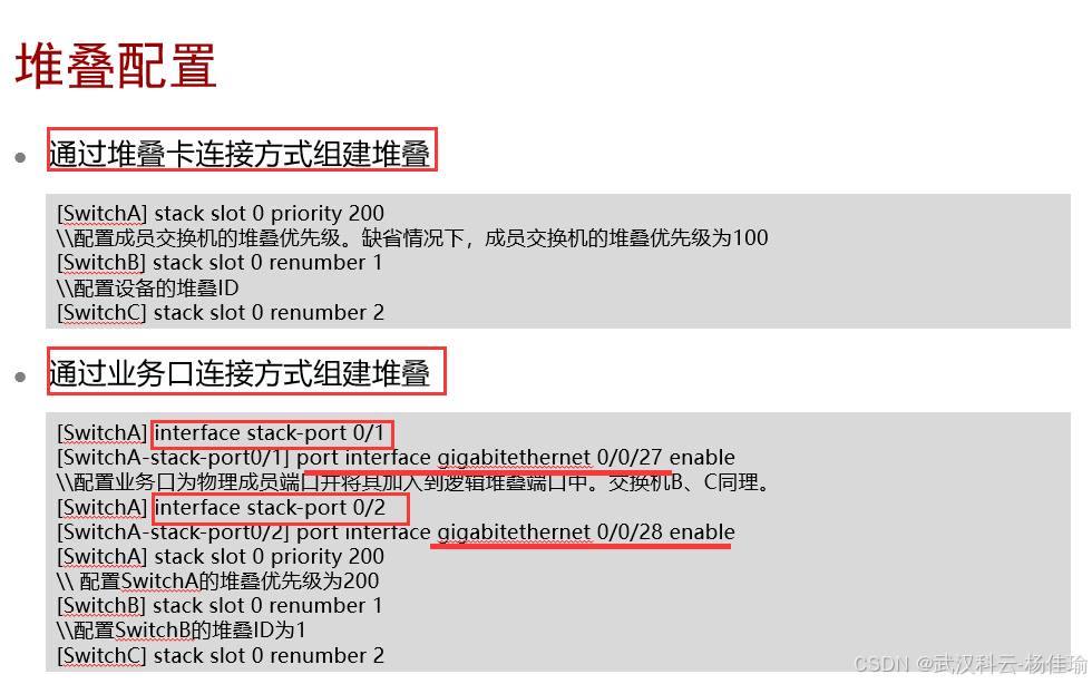 作用2:标识成员设备的槽位号,堆叠系统形成之后,备交换机和从交换机的的堆叠ID都是由主交换机分配,堆叠ID决定了成员设备的端口号(也就是设备的槽位号)