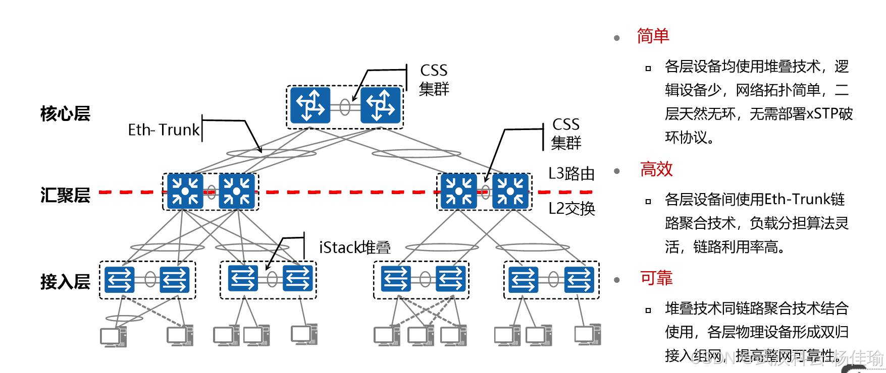 1.简化网络,两台堆叠设备可以直接看成一台设备