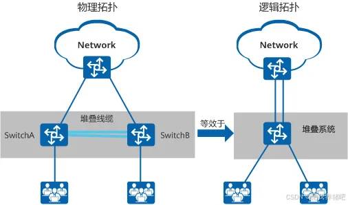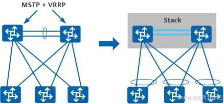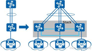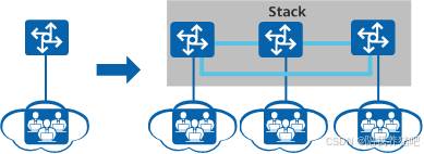传统的园区网络采用设备和链路冗余来保证高可靠性,但其链路利用率低、网络维护成本高,堆叠技术将多台交换机虚拟成一台交换机,达到简化网络部署和降低网络维护工作量的目的。