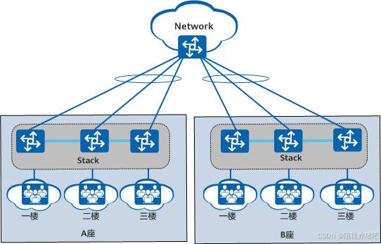 如下图所示,每个楼层的用户通过楼道交换机接入外部网络,现将各相距较远的楼道交换机连接起来组成堆叠,这相当于每栋楼只有一个接入设备,网络结构变得更加简单。每栋楼有多条链路到达核心网络,网络变得更加健壮、可靠。对多台楼道交换机的配置简化成对堆叠系统的配置,降低了管理和维护的成本。