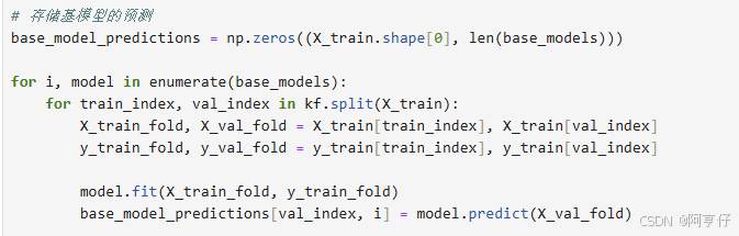 - 使用 K 折交叉验证 来训练每个基模型。每个基模型会在 K-1 个折的数据上进行训练,然后在剩下的 1 个折的数据上进行预测。这样可以确保预测结果不会过拟合。