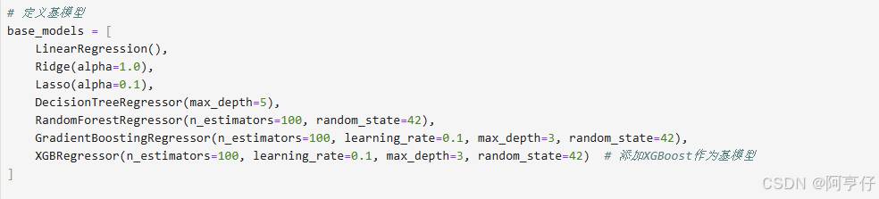 - 首先选择多个不同的基模型,这些模型可以是任何机器学习算法,比如线性回归、决策树、随机森林、支持向量机等。