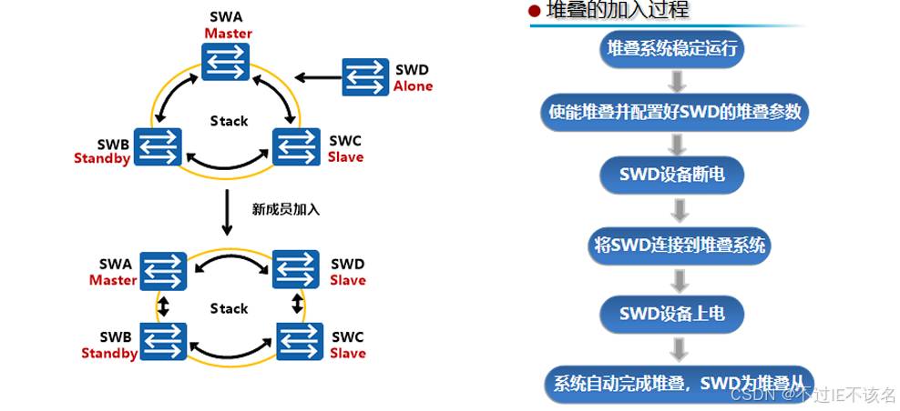 两个堆 叠系统的主交换机SWA和SWD通过竞争,选举出一个更优的作为新堆叠系统的主交换机。 竞争成功的主交换机SWA所在的堆叠系统将保持原有主备从角色和配置不变,业务也不会 受到影响;而另外一个堆叠系统的所有成员交换机SWD和SWE将重新启动,以从交换机的 角色加入到新堆叠系统,其堆叠ID将由新主交换机重新分配,并将同步新主交换机的配置 文件和系统软件,该堆叠系统的原有业务也将中断。