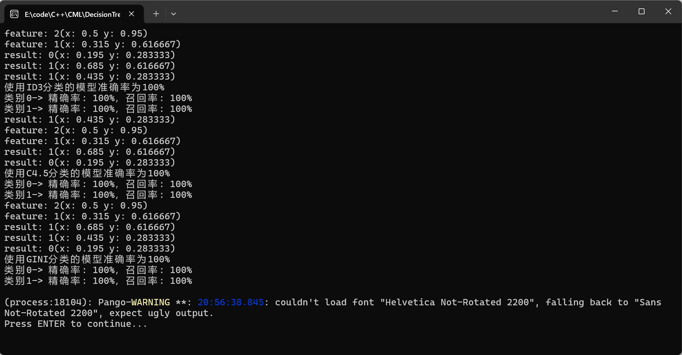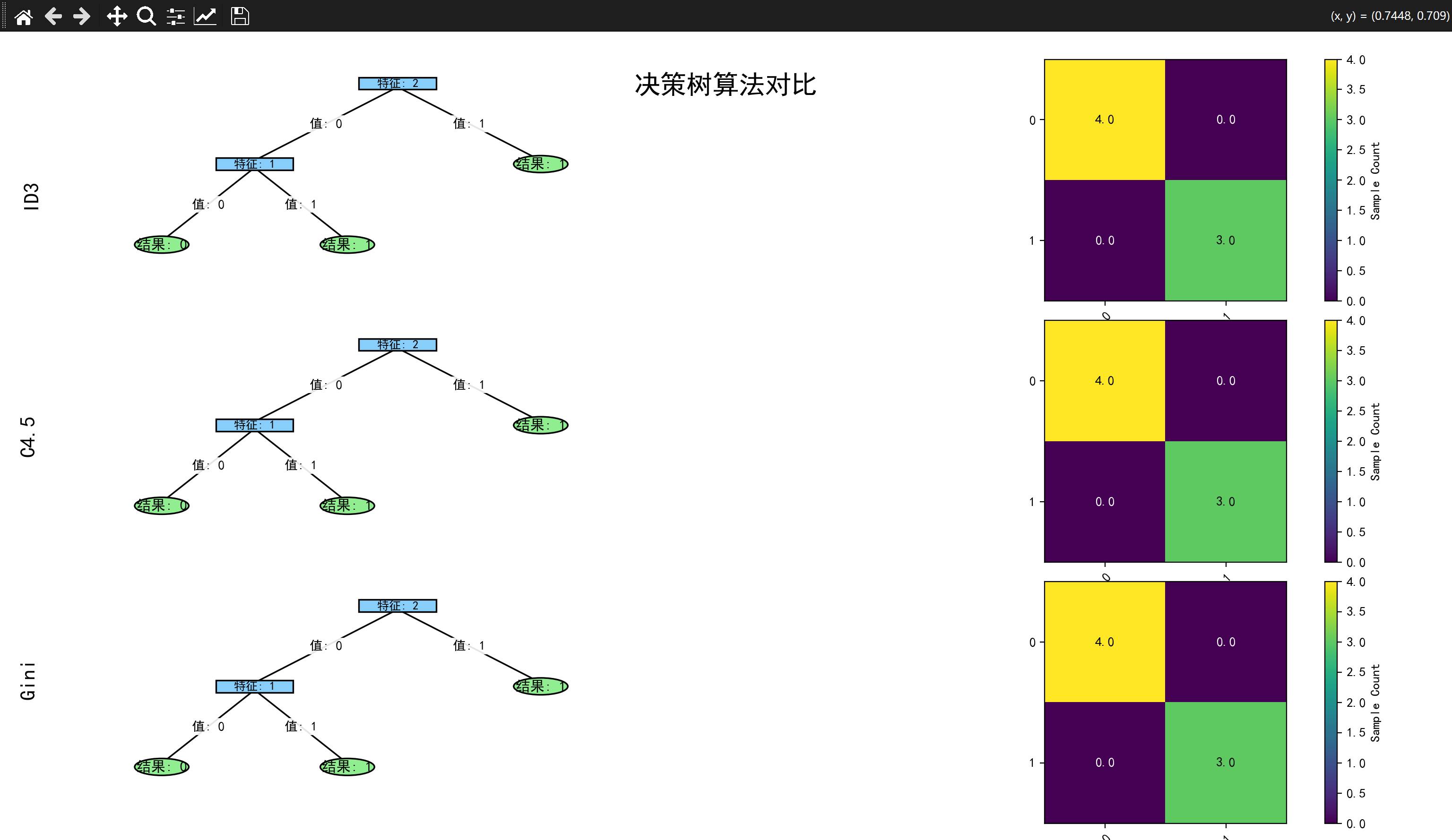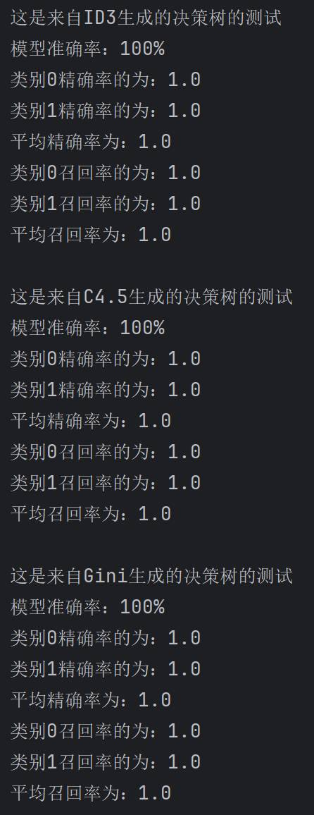 数据集的前四项是特征,最后一项是标签。我们需要先将数据导入,使用算法生成决策树,再用各种评估指标评估。就是这么简单。本文将三种算法都实现了,并可视化了决策树。(由于数据集太小了,这里就不使用K折交叉验证泛化能力了)