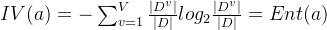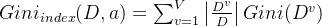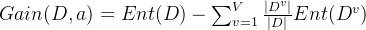 信息增益的计算公式,计算总的熵,减去某一特征分出来数据集的条件熵,v是特征a的某个类别,|D|是数据集的样本数量: