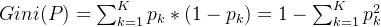 总体基尼系数公式,P是某一特征一个类别划分出来的数据集,K是数据集的标签数,p_k是某个标签的占比: