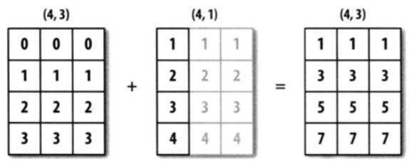 arr1的shape为(4,3),arr2的shape为(4,1),它们都是二维的,但是第二个数组在1轴上的长度为1,所以,可以在1轴上面进行广播。