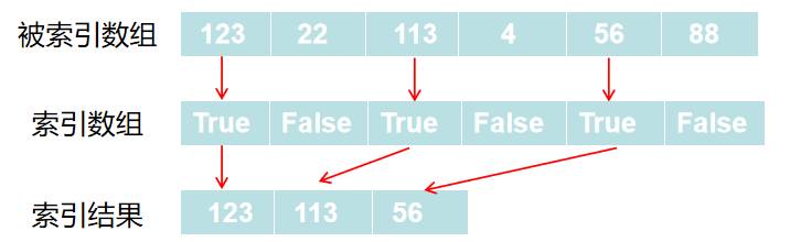 我们可以通过一个布尔数组来索引目标数组,以此找出与布尔数组中值为True的对应的目标数组中的数据,从而达到筛选出想要的数据的功能。如下图所示:(PS:需要注意的是,布尔数组的长度必须与被索引数组对应的轴的长度一致)