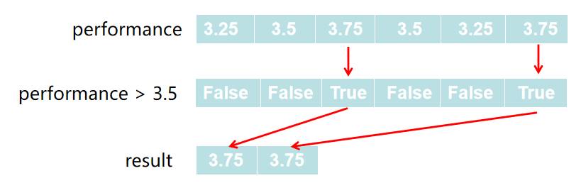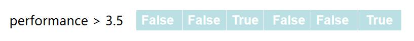 那首先就要构造出布尔数组,构造布尔数组很简单,performance > 3.5即可。此时会生成想要的布尔数组。