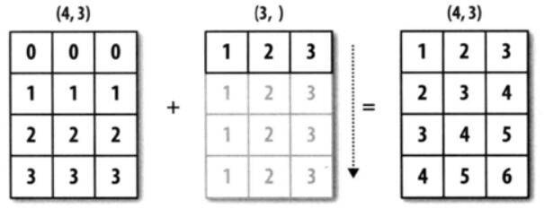 arr1的shape为(4,3),arr2的shape为(3,)。可以说前者是二维的,而后者是一维的。但是它们的后缘维度相等,arr1的第二维长度为3,和arr2的维度相同。