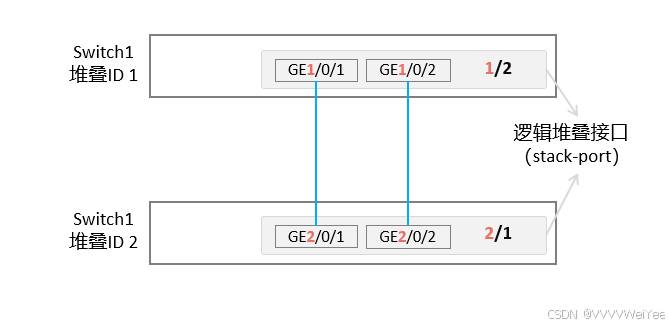 一个逻辑接口可以和多个业务口相绑定,两者间必须交叉相接stack-port n/1和stack-port m/2相接