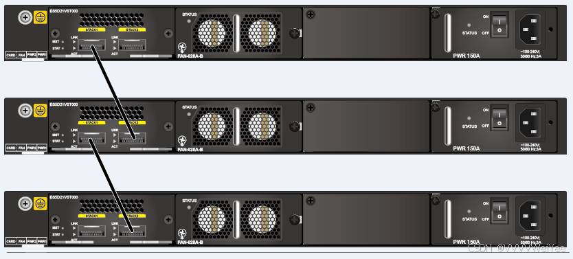 逻辑堆叠接口:交换机之间用于建立堆叠的逻辑接口,每台交换机支持两个逻辑堆叠端口,分别为stack-port n/1和stack-port n/2,其中n为成员交换机的堆叠ID