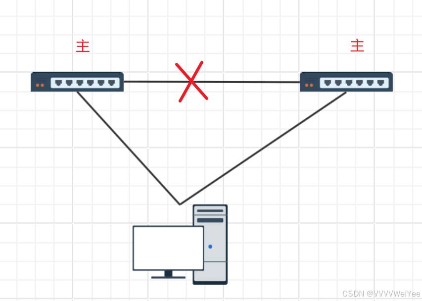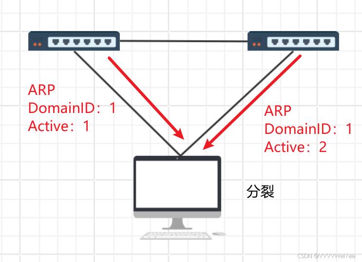 由于堆叠配置一致,当系统分裂时,双主存活可能导致网关IP冲突,网络出现问题
