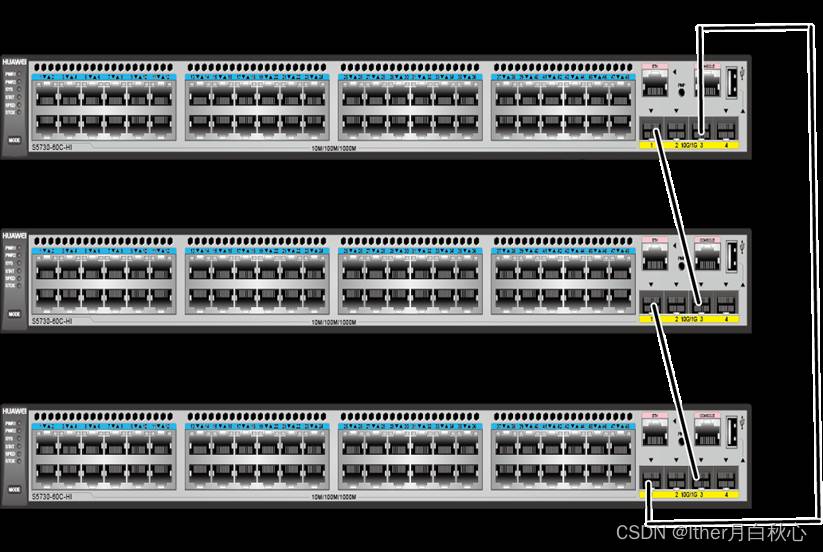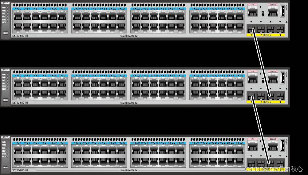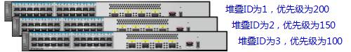 如下3台交换机组建堆叠,堆叠ID和堆叠优先级配置如下所示。待堆叠线缆连接好后,从上到下分别为交换机上电或同时为所有交换机上电。堆叠系统启动完成后,堆叠ID为1的交换机为主交换机,堆叠ID为2的交换机为备交换机,堆叠ID为3的交换机为从交换机.
