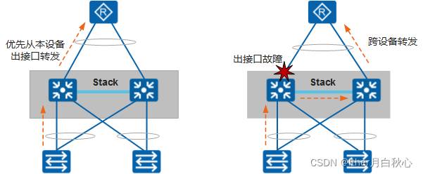 另外,跨设备Eth-Trunk组网中,为了节省堆叠线缆的带宽,跨设备的Eth-Trunk会使用流量本地优先转发功能,即本交换机收到的流量,优先从本交换机的出接口转发。只有本交换机出接口故障或无出接口时,才会通过堆叠线缆跨交换机进行转发。如下图所示。