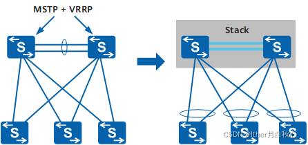 如图4所示,网络中的多台设备组成堆叠,虚拟成单一的逻辑设备。简化后的组网不再需要使用MSTP等破环协议,简化了网络配置,同时依靠跨设备的链路聚合,实现单设备故障时的快速切换,提高可靠性。