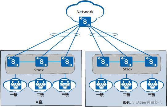 如图5所示,每个楼层的用户通过楼道交换机接入外部网络,现将各相距较远的楼道交换机连接起来组成堆叠,这相当于每栋楼只有一个接入设备,网络结构变得更加简单。每栋楼有多条链路到达核心网络,网络变得更加健壮、可靠。对多台楼道交换机的配置简化成对堆叠系统的配置,降低了管理和维护的成本。