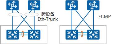 堆叠系统上行链路推荐两种连接方式:跨设备Eth-Trunk和ECMP。