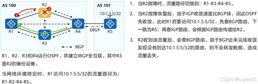 • 所以,在生产中我们可能会运用到一项技术就是 OSPF IP FRR,这项技术的原理是在主链路正常的时候就将备用链路提前计算好,方便如果主链路产生故障的时候在 50 毫秒内切换到备用链路上,保证通信的正常进行,但是配置 FRR后,被选成备用链路是有条件的,必须要满足链路保护公式:就是图中  R4到R3的开销 < R4到R1+R1到R3的。这样可以保证没有环路产生。