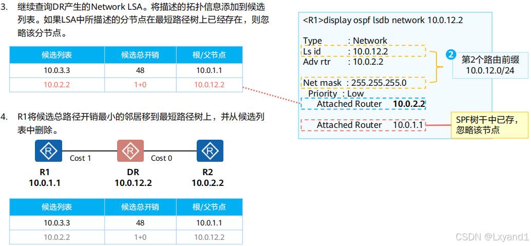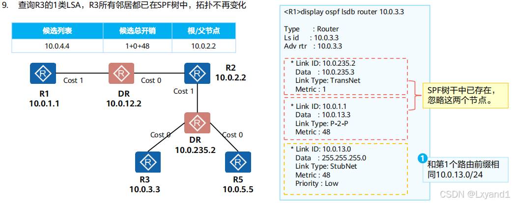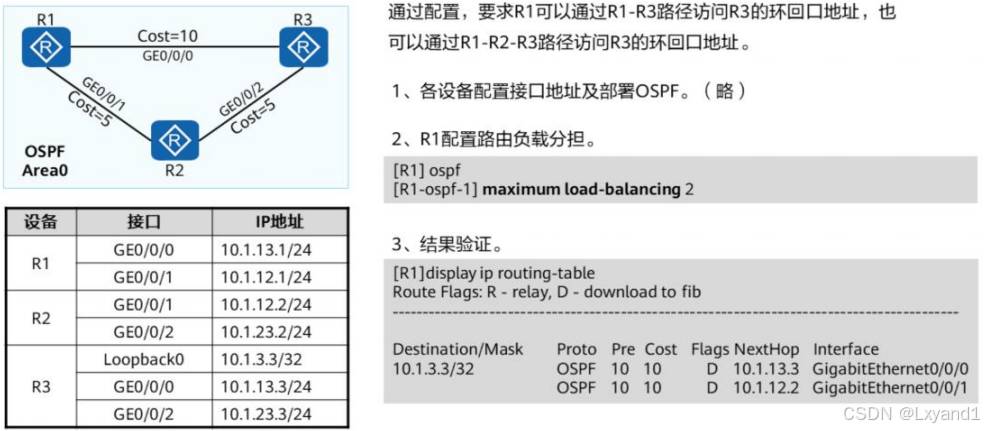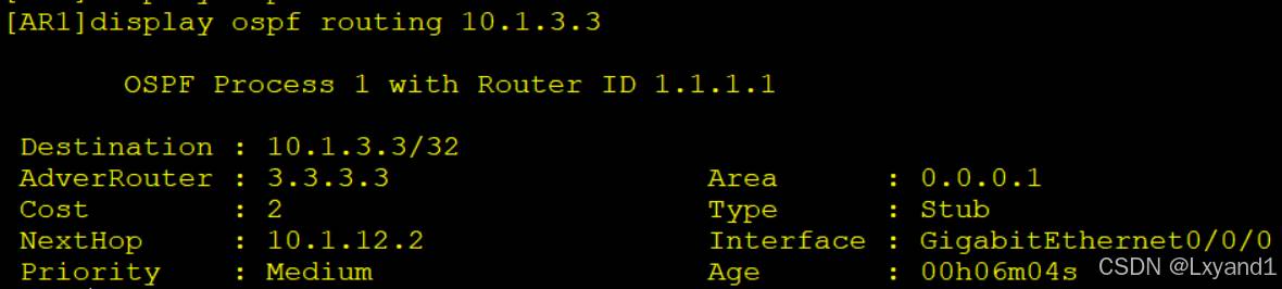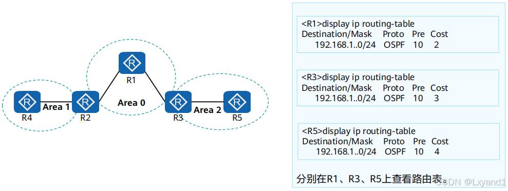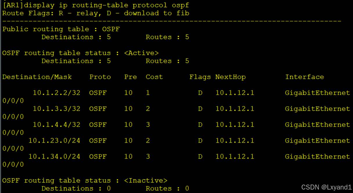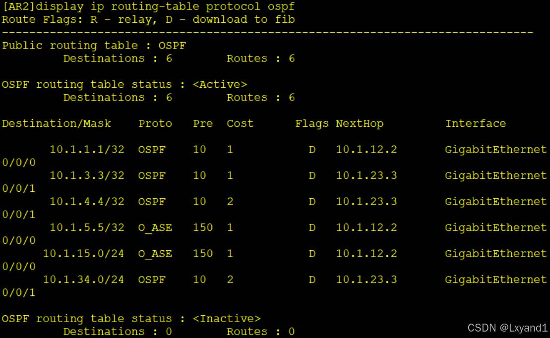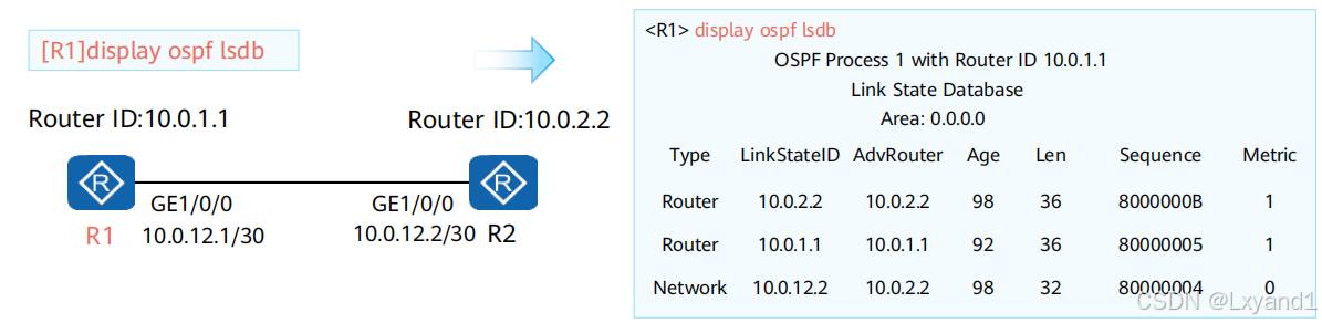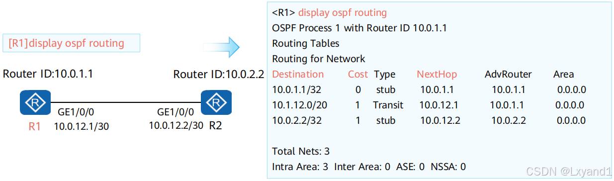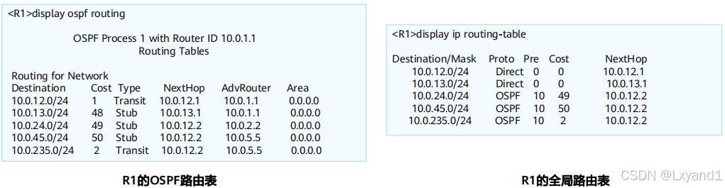• OSPF路由表和路由器路由表是两张不同的表。本例中OSPF路由表有三条路由。
