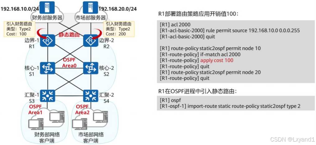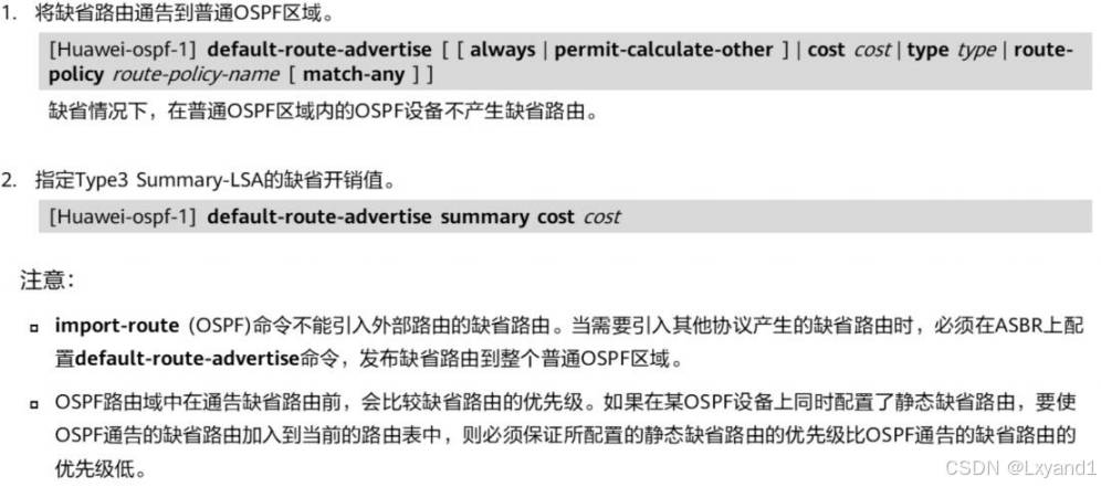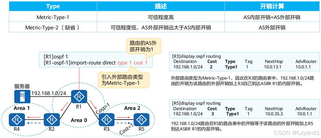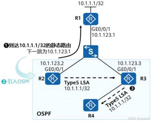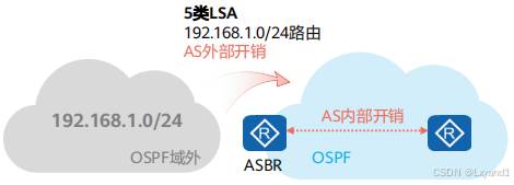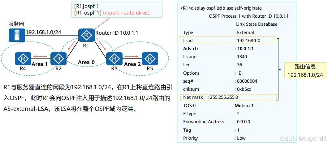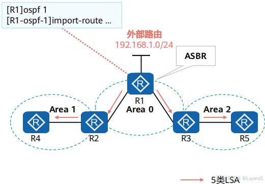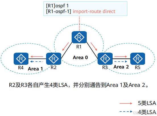 • 在 OSPF 区域中引入了外部路由,就会产生5类LSA,同时也会伴随 4类LSA 的产生在本实验中区域1中的 AR1上引入了外部路由,此时AR1为 ASBR路由器。