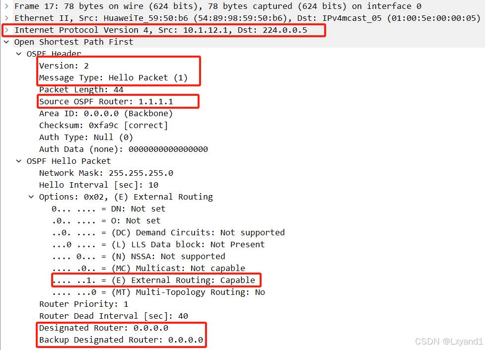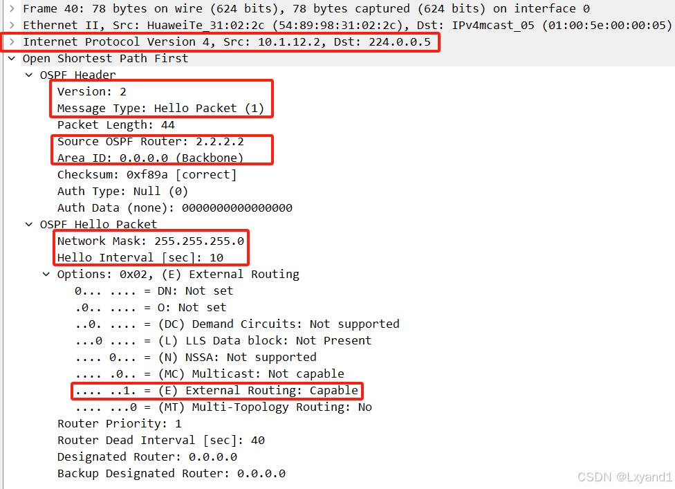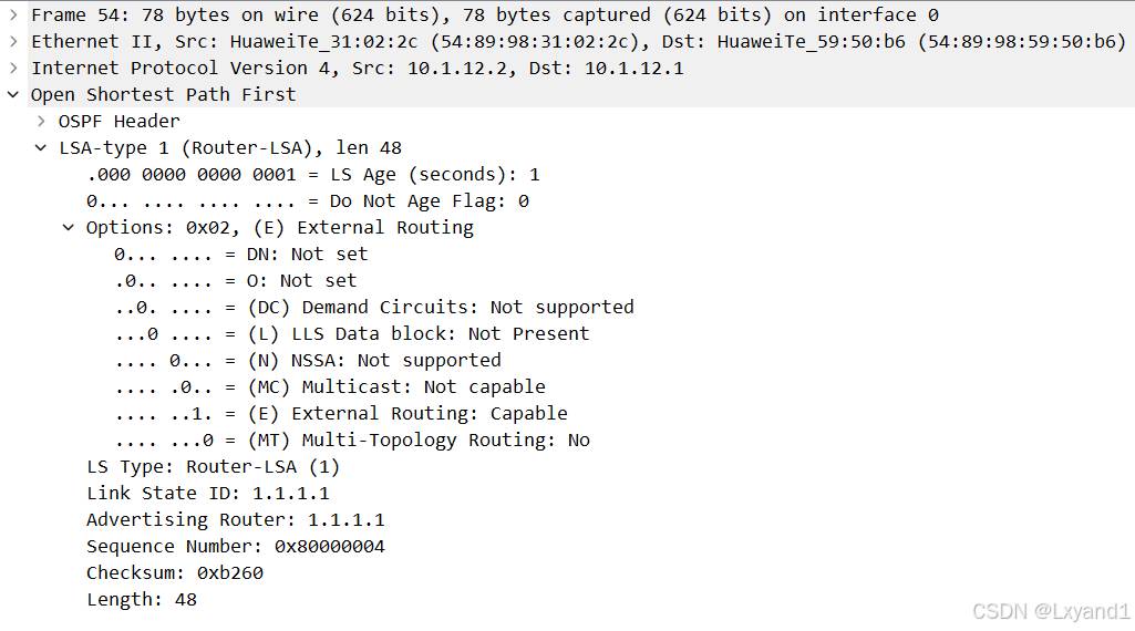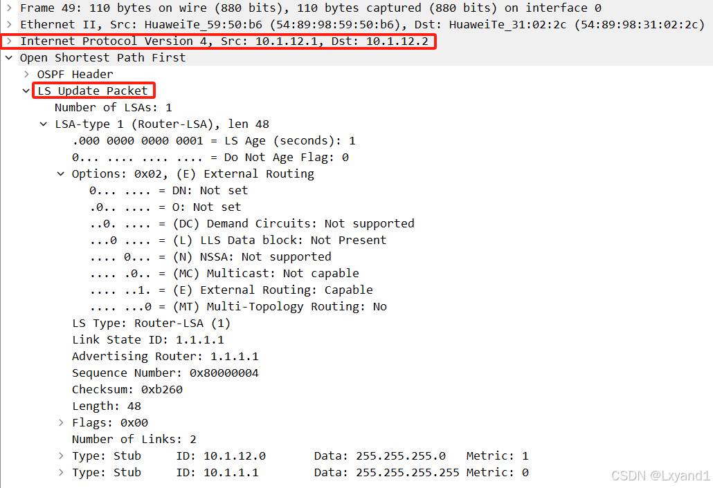 i.当AR2收到LSU后,AR2回复LSACK进行确认,LSACK报文内容如下所示: