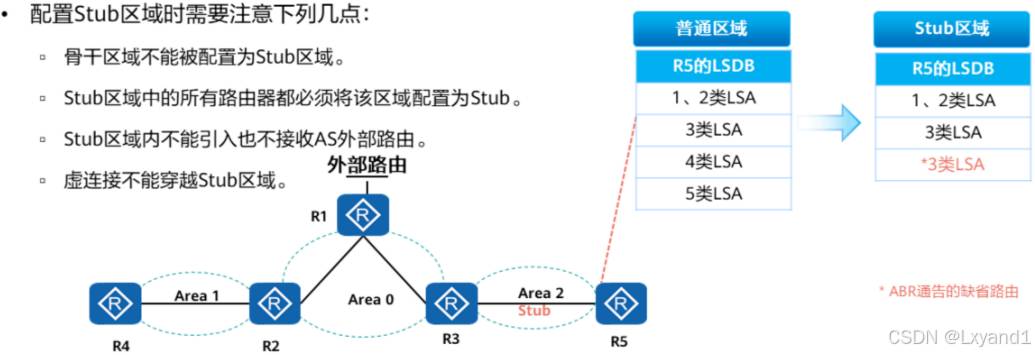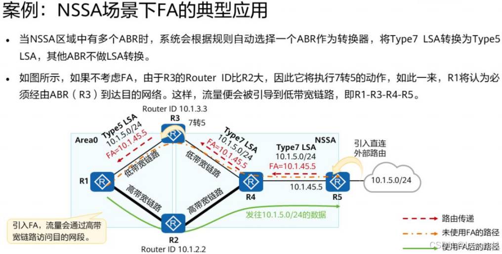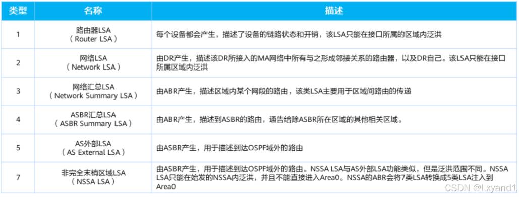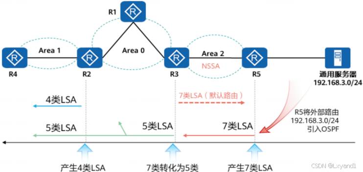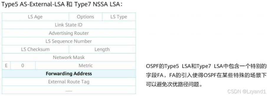• 其实 7 类 LSA 和 5 类 LSA 基本保持一致,只不过7类 LSA 只能在 ASBR 所在区域泛洪当需要泛洪到其他区域的时候,由ASBR所在区域的ABR进行7转5的操作。