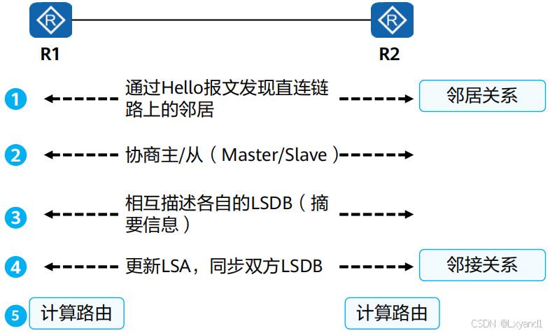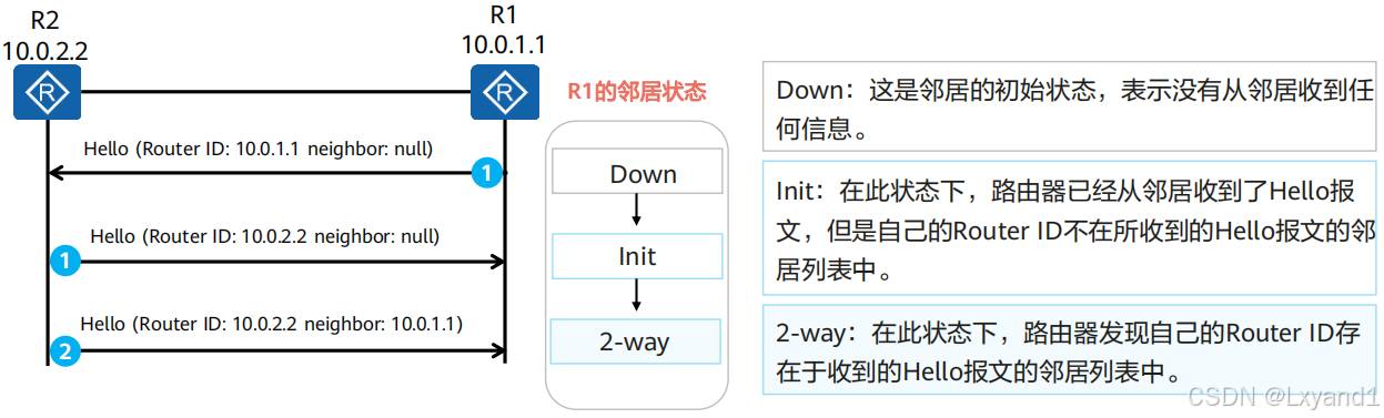 • 邻居建立:完成Hello报文中的参数协商,建立邻居关系。