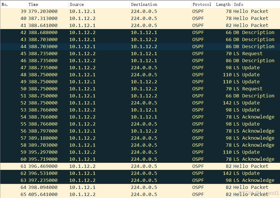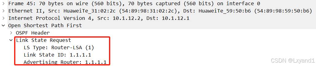 当DD报文交互完毕后,设备相互了解到了各自设备所具有的LSA,此时设备会互相发送LSR报文进行LSA请求。