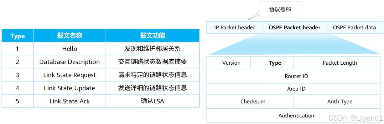 • OSPF一共定义了5种类型的报文,不同类型的OSPF报文有相同的头部格式。